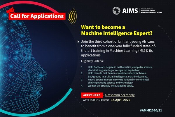 The African Institute for Mathematical Sciences (AIMS) launches applications for the third intake of its unique African Master’s in Machine Intelligence (AMMI), a fully-funded one-year intensive master’s program that provides brilliant young Africans with state-of-the-art training in Machine Learning (ML) and its applications at campuses in Rwanda and Ghana.
