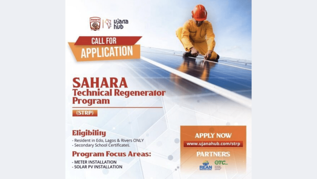 Sahara Foundation has opened a call for application for suitably qualified secondary school leavers and OND holders in Edo, Lagos and Rivers state to the Sahara Technical Regenerator Program (STERP). This is a strategic partnership between Sahara Foundation, the Energy Training Center (ETC) and the Renewable Energy Association of Nigeria (REAN).